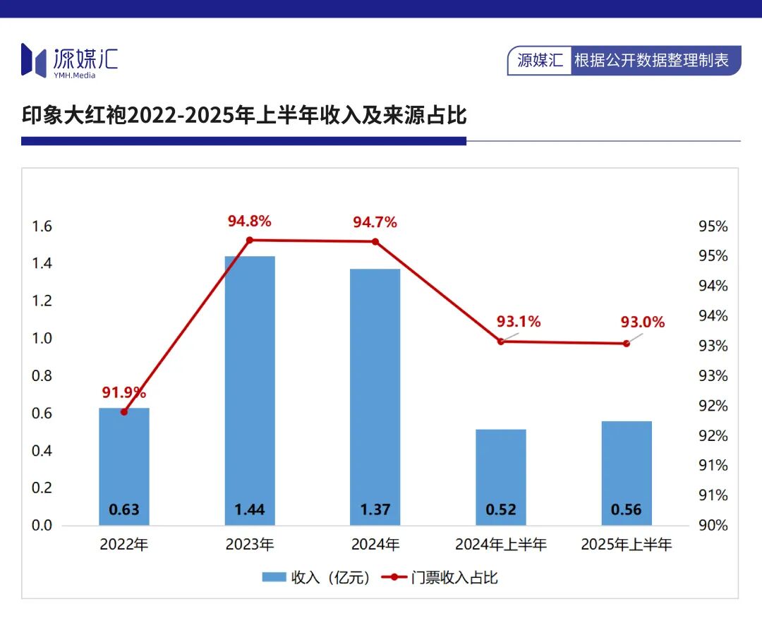 2022年至2025年上半年,印象大红袍分别实现收入0.63亿元、1.44亿元、1.37亿元和0.56亿元,门票收入占比区间值为91.9%至94.8%,其中《印象·大红袍》常年贡献超90%。