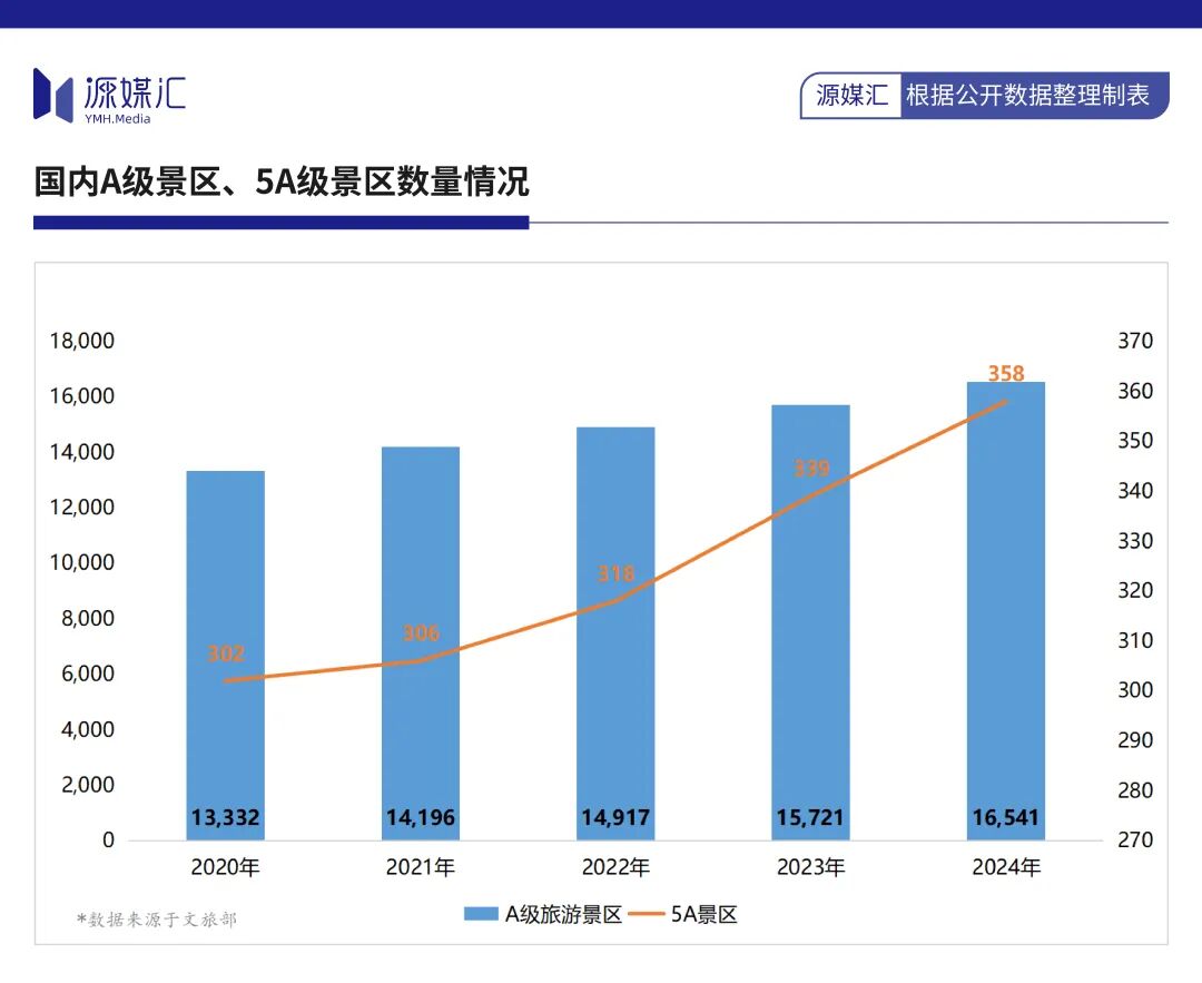 过去5年时间里,旅游景区进入了爆发式增长,A级旅游景区从2020年的13,332个飙升到2024年的16,541个。其中,5A级景区从302个上升至358个,平均每年产出641个A级景区、11个5A级景区。