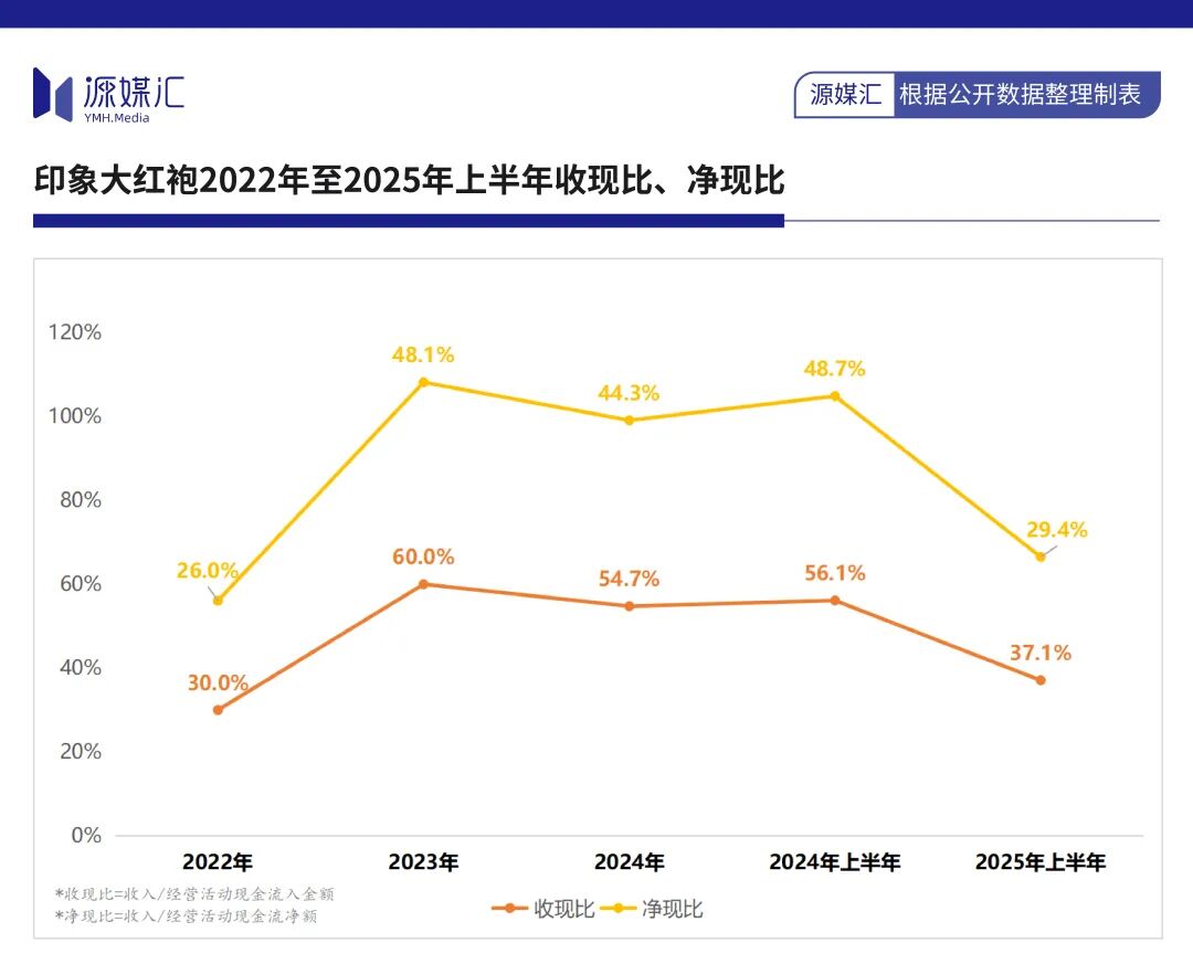 2022年至2024年,印象大红袍经营活动现金流净额分别为1641.7万元、6926.5万元、6079.4万元;2025年上半年继续走低,同比下滑34.5%至1643.8万元。
