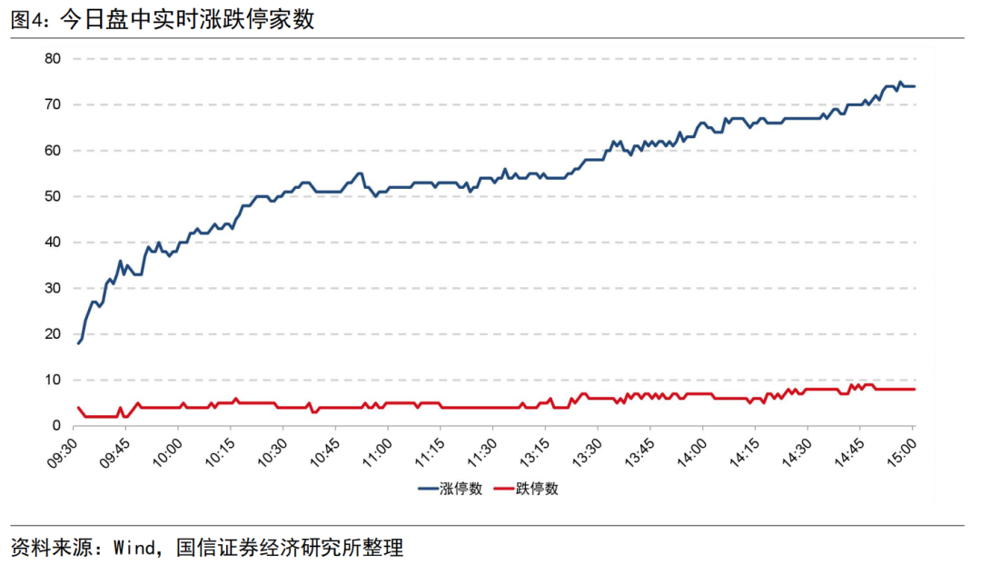 我们统计上市满3个月以上的股票在今日盘中的实时涨跌停家数情况。今日盘中最高有75只股票涨停,收盘时有74只股票涨停,盘中最高有9只股票跌停,收盘时有8只股票跌停,今日日内实时涨跌停家数如下图所示。