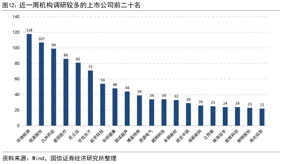 上市公司会披露投资者或分析师对其的调研活动。这里我们统计近7天内对上市公司调研或举行分析师会议的机构数量。下图展示了近一周内被机构调研较多的前二十名上市公司,不足二十名时直接取现有数量。可以看到,近一周内调研机构较多的股票是华测检测、视源股份、九洲药业、爱朋医疗、民士达、仕佳光子、航宇科技、华邦健康等,华测检测被118家机构调研。