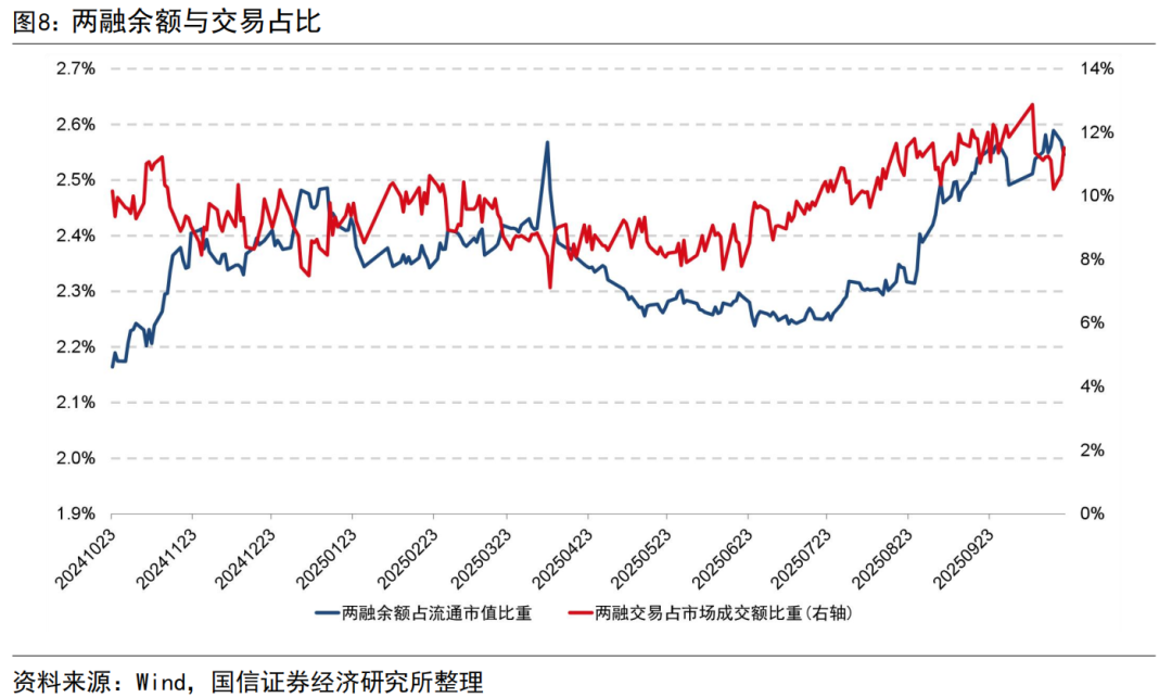 我们计算两融余额占市场总流通市值的比重与两融交易(融资买入额+融券卖出额)占市场总成交额的比例来反映两融交易的活跃情况。近一年来两融余额占流通市值的比重维持在2.4%左右,两融交易占市场成交额的比重维持在9.6%左右,截至 20251021 两融余额占流通市值比重为2.5%,两融交易占市场成交额比重为11.5%,近一年两融余额与交易占比如下图所示。