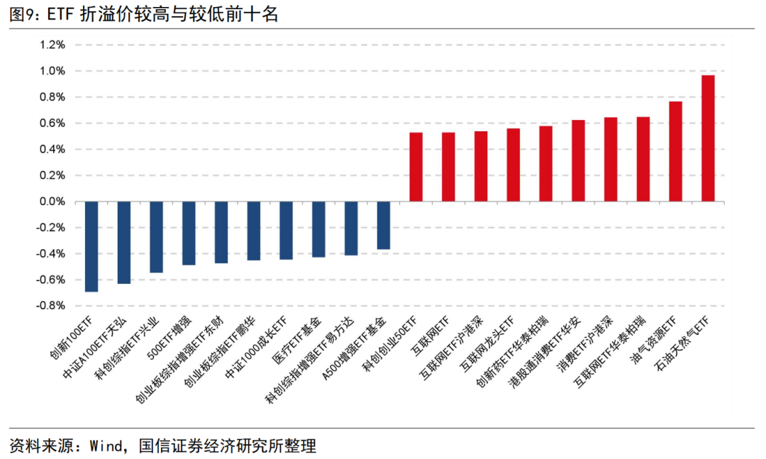 ETF是一种在交易所上市交易的、基金份额可变的开放式基金,其可在场外进行申购赎回,也可以在场内交易。其在场内交易的价格与场外价格的差距在一定程度上反映了投资者的情绪。这里我们统计日成交额超过100万的境内交易股票型ETF的折溢价情况。20251021当日溢价较多的是石油天然气ETF,溢价0.97%,折价较多的是创新100ETF,折价0.69%,折溢价较高与较低的前十名ETF如下图所示。