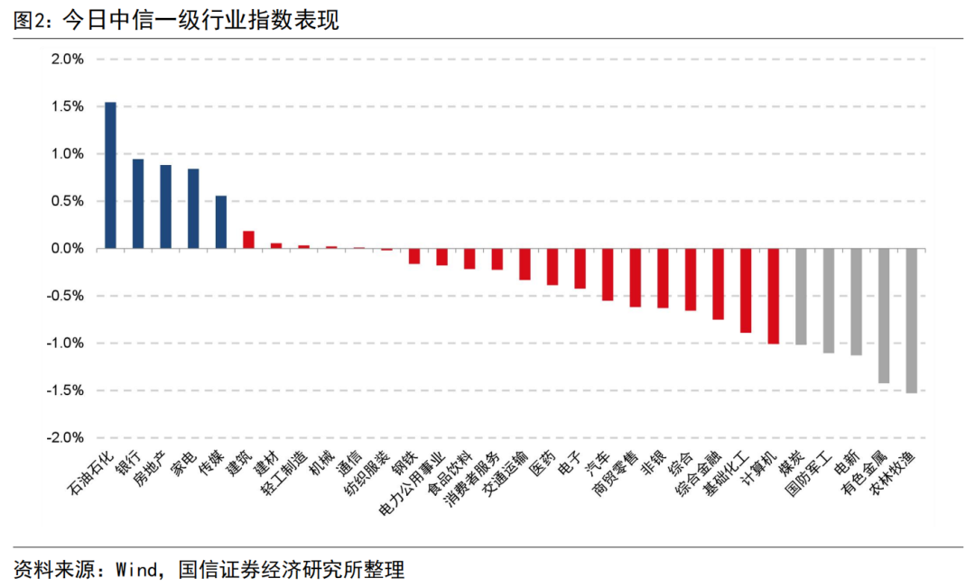 今日石油石化、银行、房地产、家电、传媒行业表现较好,收益分别为1.55%、0.94%、0.88%、0.84%、0.56%,农林牧渔、有色金属、电新、国防军工、煤炭行业表现较差,收益分别为-1.53%、-1.42%、-1.13%、-1.11%、-1.02%,中信一级行业指数今日表现如下图所示。