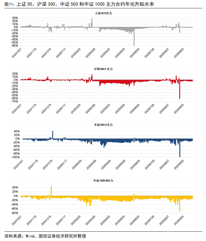 近一年以来上证50、沪深300、中证500、中证1000股指期货主力合约的年化贴水率中位数分别为0.15%、3.05%、10.33%、12.81%,20251022当日上证50股指期货主力合约年化贴水率为0.89%,处于近一年来41%分位点,当日沪深300股指期货主力合约年化贴水率为3.78%,处于近一年来38%分位点;当日中证500股指期货主力合约年化贴水率为9.76%,处于近一年来54%分位点;当日中证1000股指期货主力合约年化贴水率为12.13%,处于近一年来55%分位点。近一年上证50、沪深300、中证500和中证1000主力合约年化升贴水率如下图所示。