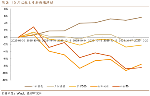 红利板块延续领涨,培育钻石板块爆发,贵金属调整。今日红利指数再度上涨,涨幅0.75%,10月以来累计上涨5.60%表现强势,明显强于上证指数的下跌0.49%,同期沪深300、创业板指、科创50则分别下跌2.21%、7.56%、8.52%,显示市场避险情绪依然较浓。细分概念来看,培育钻石板块上涨13.43%,四方达20%涨停、力量钻石涨18.71%,消息面上,力量钻石宣布成功培育156.47克拉人工钻石原石,推动行业技术突破预期升温,叠加我国10月9日对超硬材料出口管制情绪共振推动板块爆发。黄金珠宝指数下跌4.43%,主要或受国际金价短期回调及美元指数反弹影响。