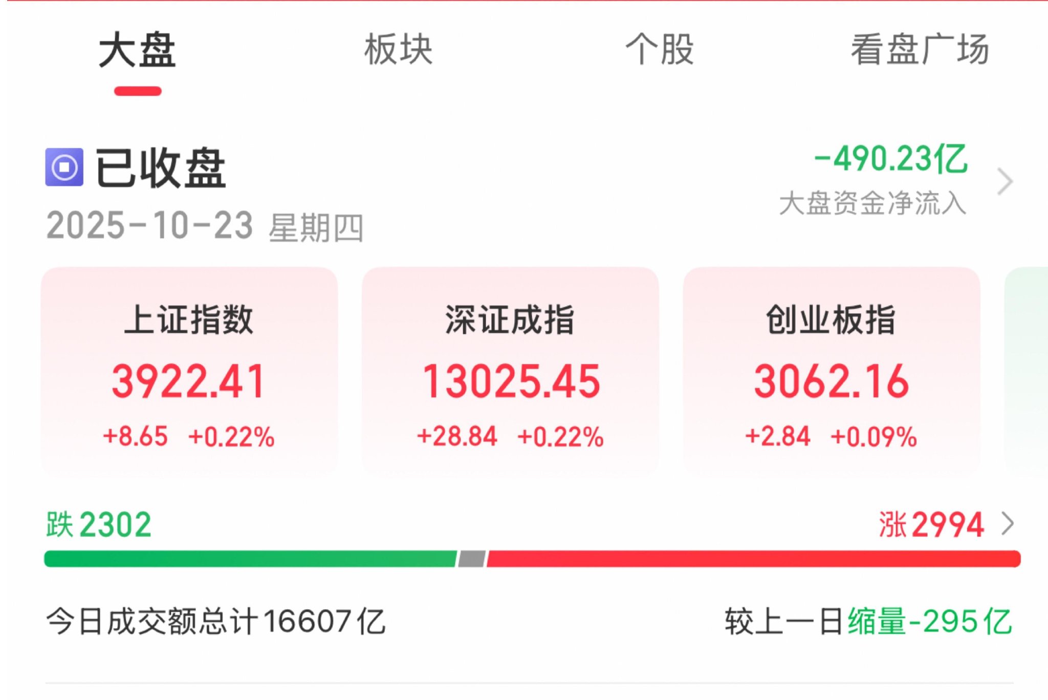 A股三大指数今日集体上涨,截至收盘,上证指数涨0.22%,深证成指涨0.22%,创业板指涨0.09%,北证50跌1.07%。沪深京三市全天成交额16607亿元,较上日缩量295亿元。全市场近3000只个股上涨。
