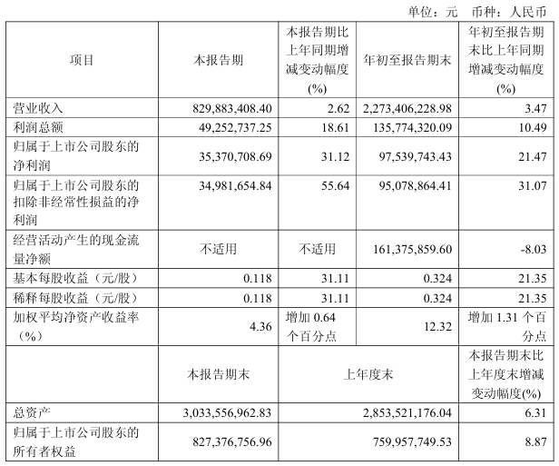 值得注意的是,该公司前三季度营收和净利润均实现增长。其中,一、二、三季度营收增速分别为10.31%、0.10%和2.62%,同期净利润增速分别为23.70%、14.47%和31.12%。
