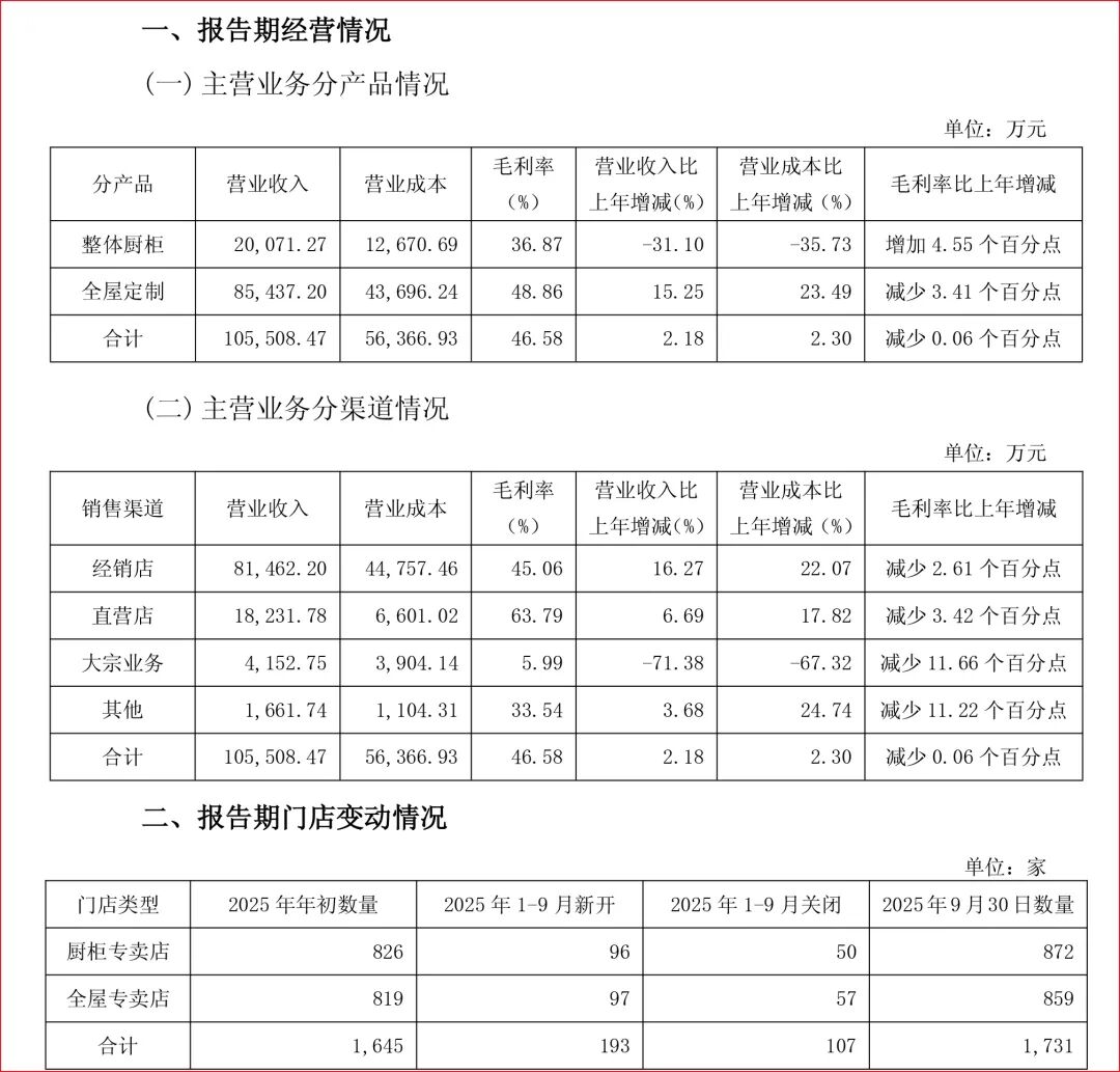 此外,从我乐家居发布的《关于2025年前三季度主要经营数据的公告》可以看到,近年来我乐家居渠道布局深化成果显著,经销与直营两大核心渠道均实现营收同比增长,为整体营收增长提供重要支撑。前三季度,整体厨柜营收约2.01亿元,同比减少31.1%,毛利率36.87%。全屋定制营收约8.54亿元,同比增长15.25%,毛利率48.86%。分渠道看,经销店营收约8.15亿元,同比增长16.27%,毛利率45.06%。直营店收入约1.82亿元,同比增长6.69%,毛利率63.79%。大宗业务收入4152.75万元,同比减少71.38%。