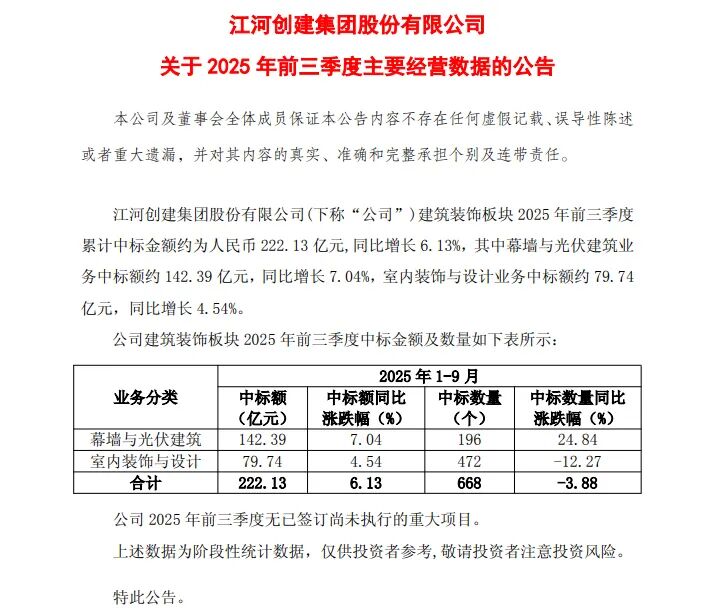 10月15日,江河集团公告显示,公司建筑装饰板块2025年前三季度累计中标金额约为222.13亿元,同比增长6.13%,其中幕墙与光伏建筑业务中标额约142.39亿元同比增长7.04%,室内装饰与设计业务中标额约79.74亿元,同比增长4.54%。