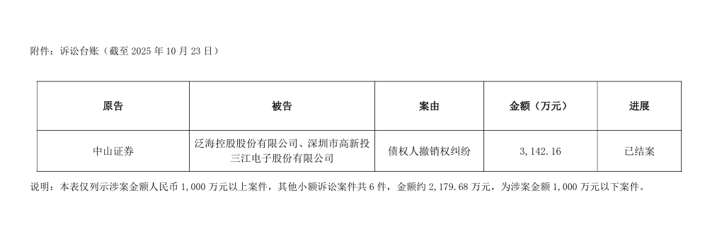说明:本表仅列示涉案金额人民币1,000万元以上案件,其他小额诉讼案件共6件,金额约2,179.68万元,为涉案金额1,000万元以下案件。