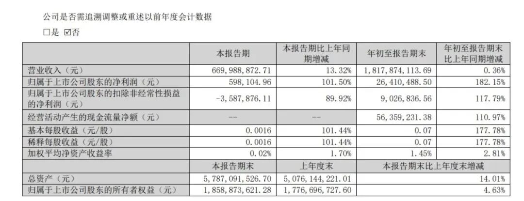 报告显示,凯伦股份第三季度单季实现营业收入6.7亿元,同比上升13.32%;归母净利润为59.81万元,相比去年同期亏损近3991万元实现强势扭转。扣除非经常性损益后的归母净利润虽仍为负值,但亏损幅度已从去年同期的3558万元大幅收窄至359万元,显示主营业务盈利能力正逐步修复。