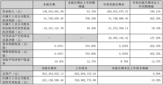 公司第三季度表现尤为“亮眼”。数据显示,公司第三季度实现营业收入1.39亿元,同比增长53.35%,净利润6174.91万元,同比增长706.3%。公司表示,业绩增长主要系本期能源销售较上年同期大幅增加所致。