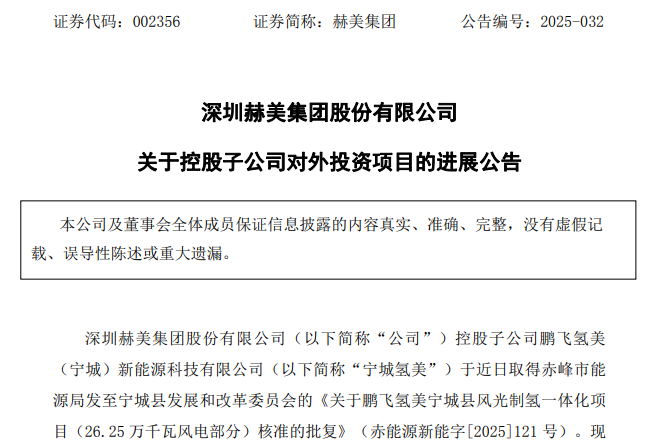 此外,公司位于赤峰市宁城县的“鹏飞氢美宁城县风光制氢一体化项目(26.25万千瓦风电部分)”也获得赤峰市能源局批复。该项目总投资31.35亿元,其中风电部分约13.20亿元,制氢制醇部分约18.15亿元。