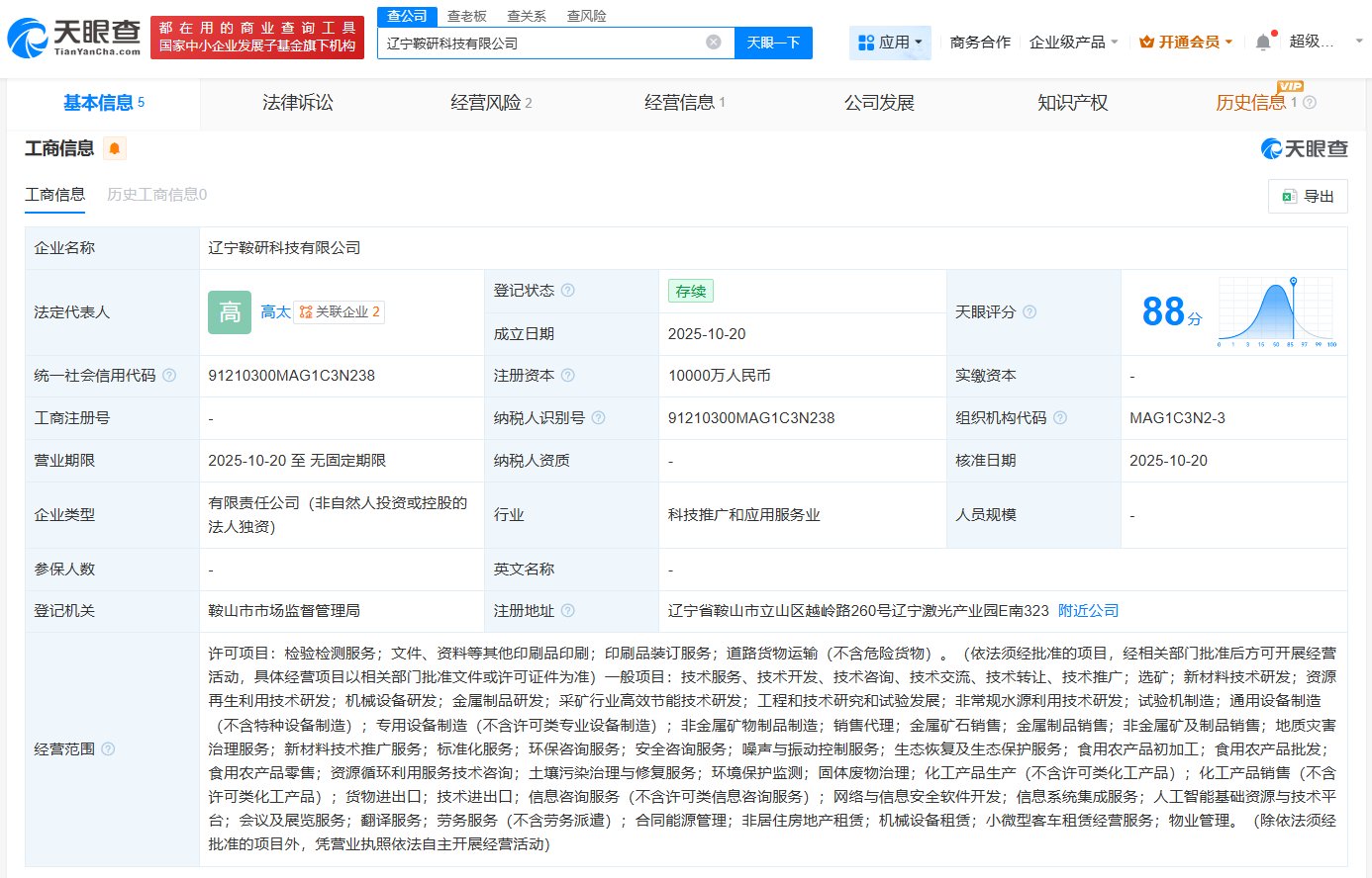 每经AI快讯,天眼查App显示,近日,辽宁鞍研科技有限公司成立,法定代表人为高太,注册资本1亿元,经营范围包括新材料技术研发、资源再生利用技术研发、机械设备研发、金属制品研发等,由鞍钢集团矿业有限公司全资持股。