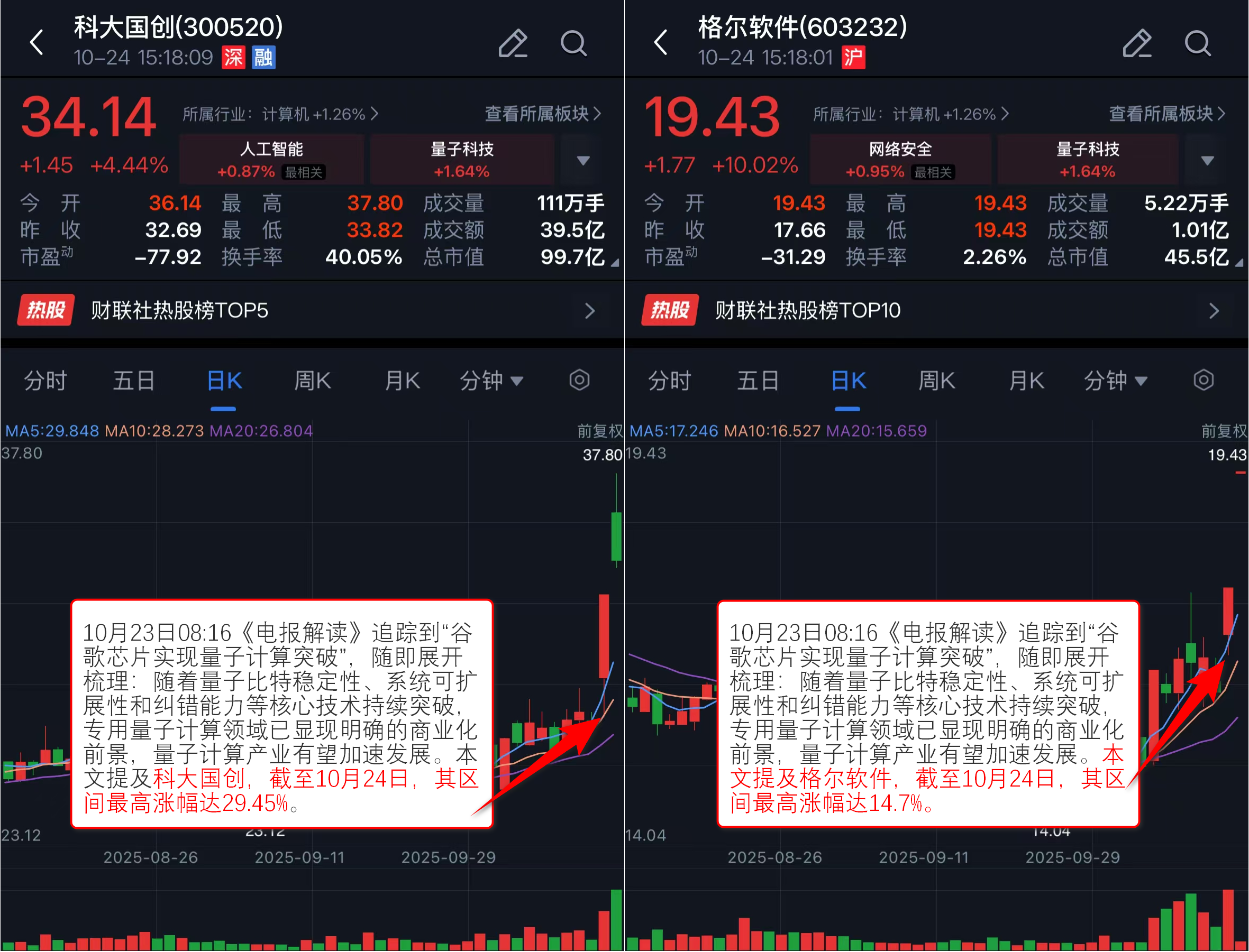 10月23日08:16《电报解读》追踪到“谷歌芯片实现量子计算突破”,随即展开梳理:随着量子比特稳定性、系统可扩展性和纠错能力等核心技术持续突破,专用量子计算领域已显现明确的商业化前景,量子计算产业有望加速发展。本文提及科大国创、格尔软件,截至10月24日,其区间最高涨幅达29.45%、14.7%。