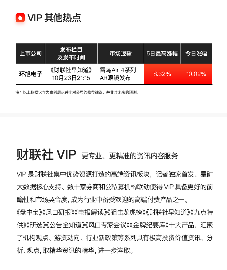 注:财联社VIP为内容资讯产品,并非投资建议。以下内容仅为资讯价值展示非对相关公司的推荐建议,非未来走势预测。投资有风险,入市需谨慎。