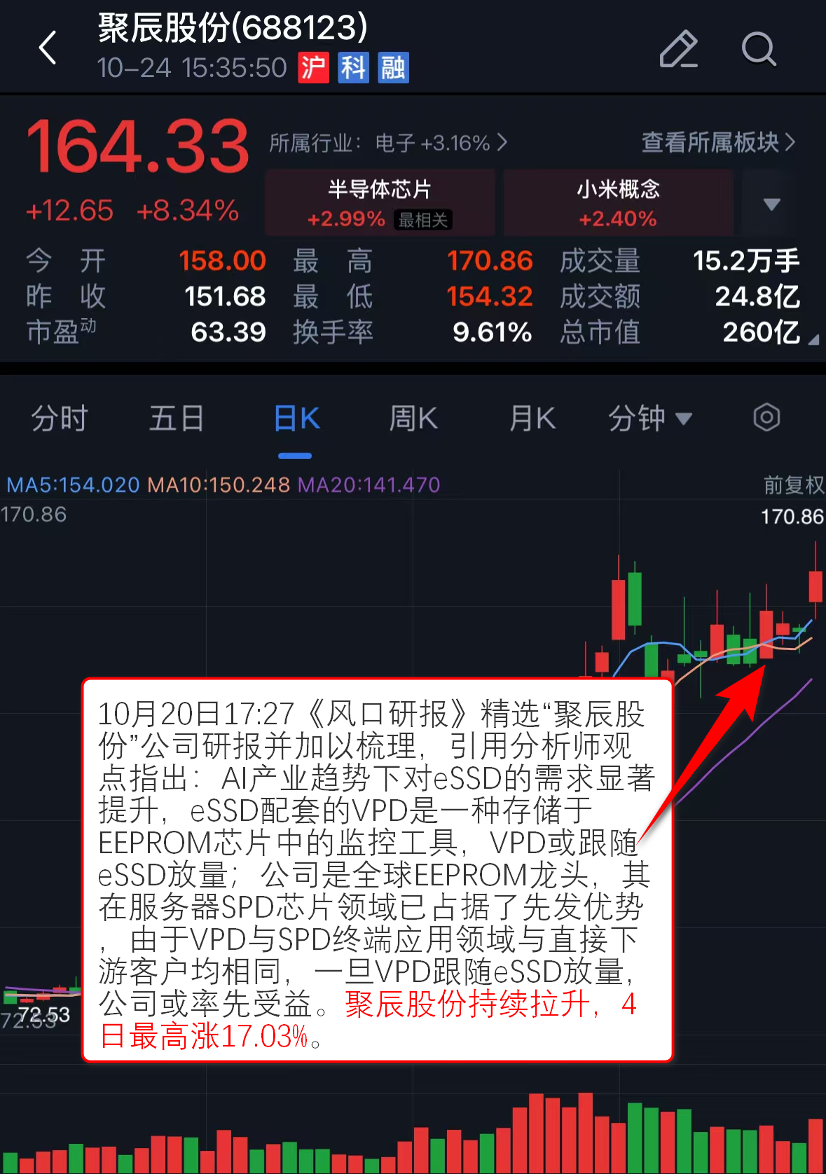 10月20日17:27《风口研报》精选“聚辰股份”公司研报并加以梳理,引用分析师观点指出:AI产业趋势下对eSSD的需求显著提升,eSSD配套的VPD是一种存储于EEPROM芯片中的监控工具,VPD或跟随eSSD放量;公司是全球EEPROM龙头,其在服务器SPD芯片领域已占据了先发优势,由于VPD与SPD终端应用领域与直接下游客户均相同,一旦VPD跟随eSSD放量,公司或率先受益。聚辰股份持续拉升,4日最高涨17.03%。