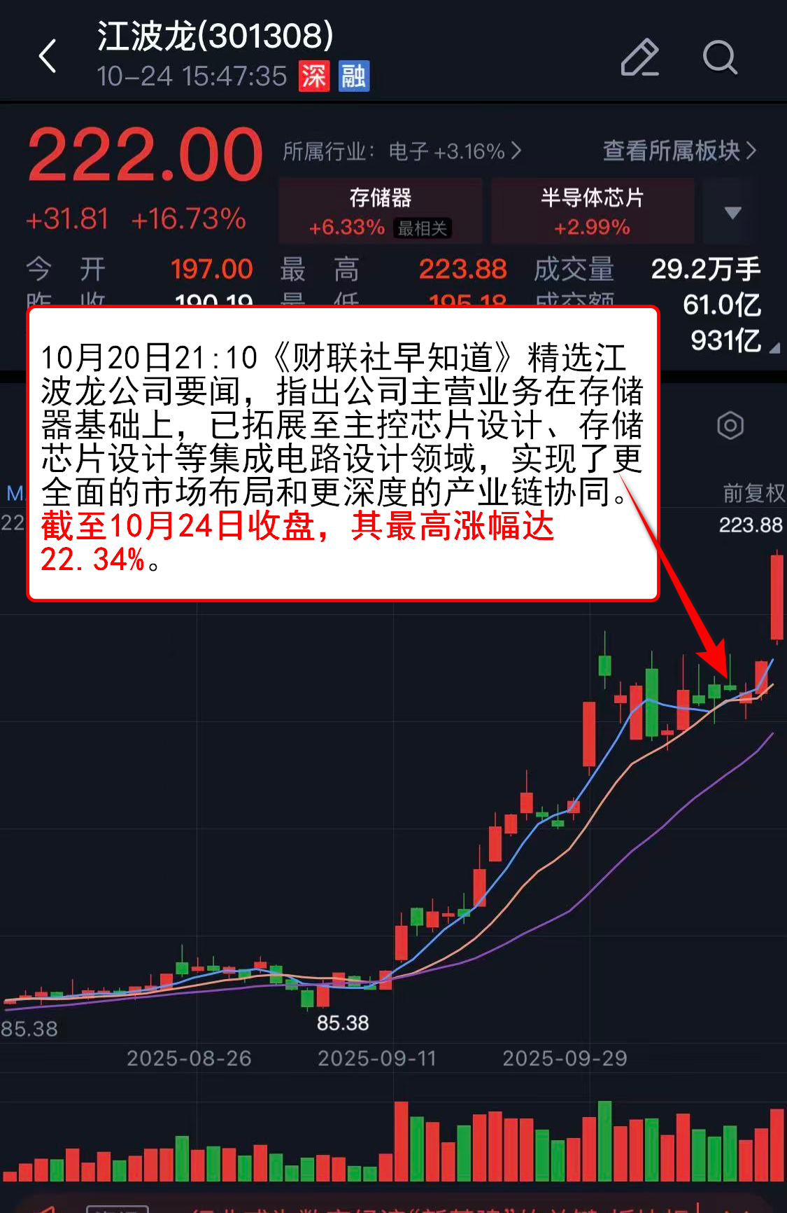 10月20日21:10《财联社早知道》精选江波龙公司要闻,指出公司主营业务在存储器基础上,已拓展至主控芯片设计、存储芯片设计等集成电路设计领域,实现了更全面的市场布局和更深度的产业链协同。截至10月24日收盘,其最高涨幅达22.34%。