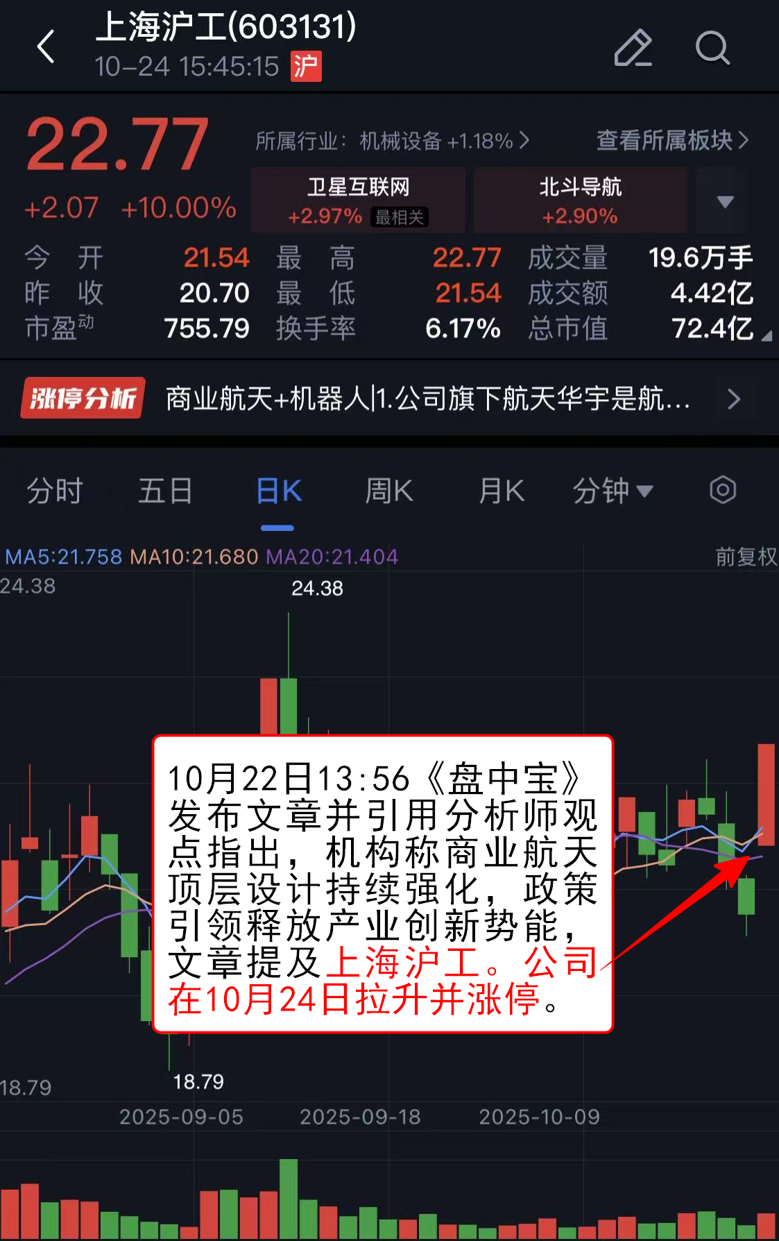 10月22日13:56《盘中宝》发布文章并引用分析师观点指出,机构称商业航天顶层设计持续强化,政策引领释放产业创新势能,文章提及上海沪工。公司在10月24日拉升并涨停。