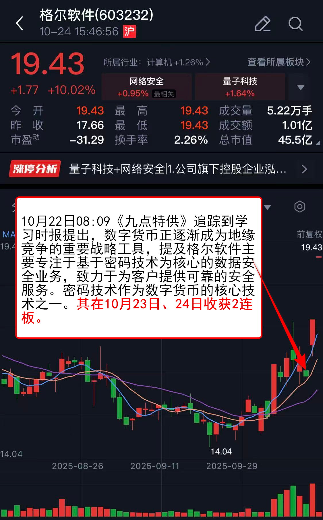 10月22日08:09《九点特供》追踪到学习时报提出,数字货币正逐渐成为地缘竞争的重要战略工具,提及格尔软件主要专注于基于密码技术为核心的数据安全业务,致力于为客户提供可靠的安全服务。密码技术作为数字货币的核心技术之一。其在10月23日、24日收获2连板。