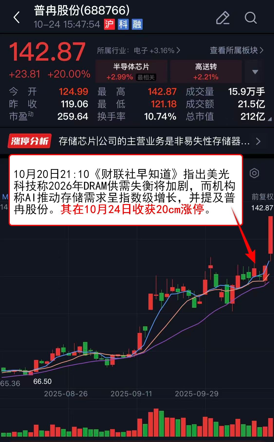 10月20日21:10《财联社早知道》指出美光科技称2026年DRAM供需失衡将加剧,而机构称AI推动存储需求呈指数级增长,并提及普冉股份。其在10月24日收获20cm涨停。