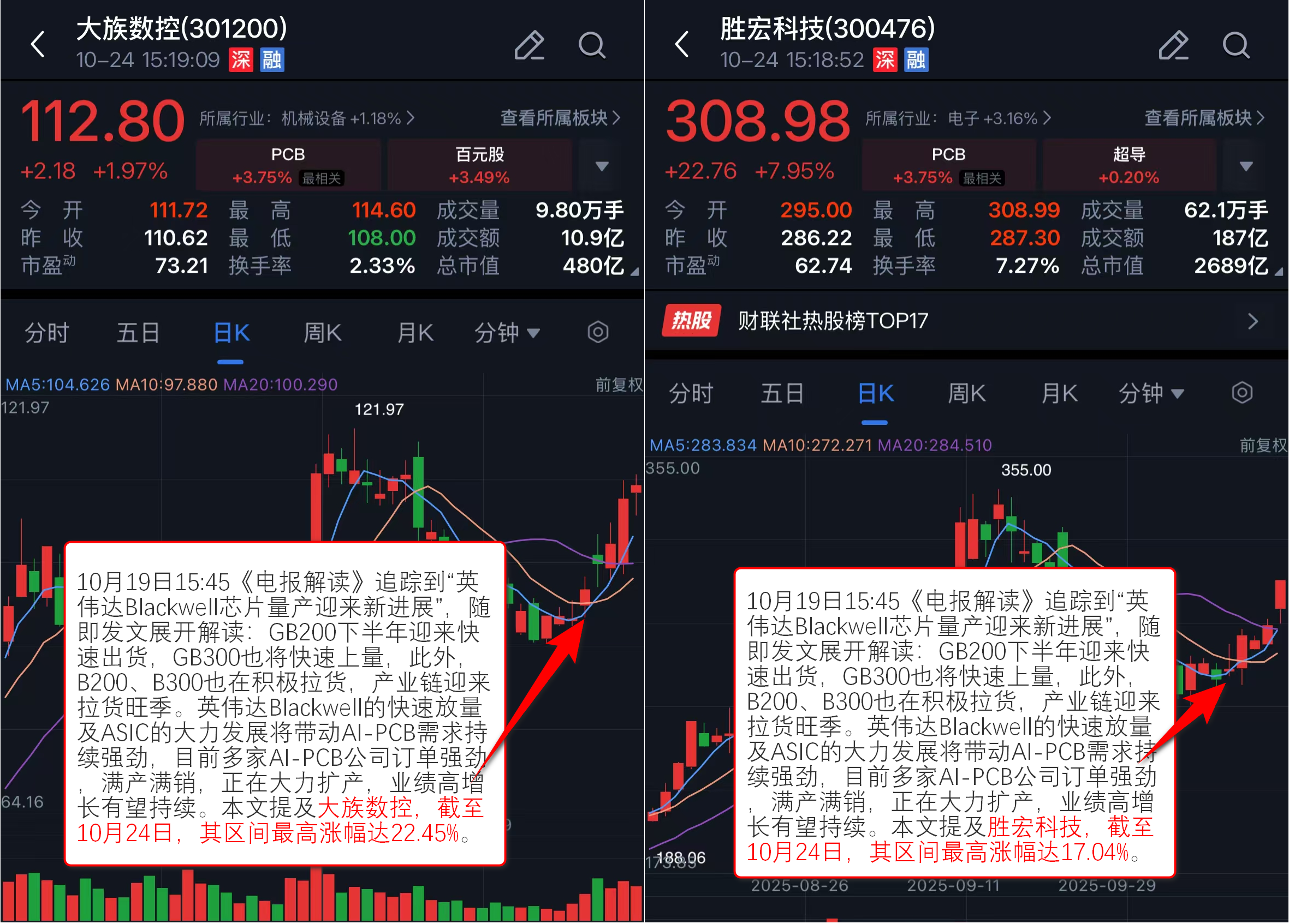 10月19日15:45《电报解读》追踪到“英伟达Blackwell芯片量产迎来新进展”,随即发文展开解读:GB200下半年迎来快速出货,GB300也将快速上量,此外,B200、B300也在积极拉货,产业链迎来拉货旺季。英伟达Blackwell的快速放量及ASIC的大力发展将带动AI-PCB需求持续强劲,目前多家AI-PCB公司订单强劲,满产满销,正在大力扩产,业绩高增长有望持续。本文提及胜宏科技、大族数控,截至10月24日,其区间最高涨幅达17.04%、22.45%。