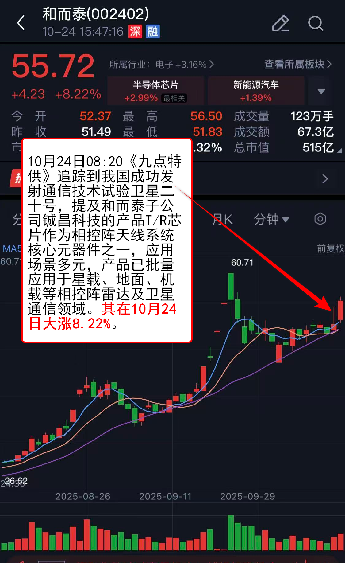 10月24日08:20《九点特供》追踪到我国成功发射通信技术试验卫星二十号,提及和而泰子公司铖昌科技的产品T/R芯片作为相控阵天线系统核心元器件之一,应用场景多元,产品已批量应用于星载、地面、机载等相控阵雷达及卫星通信领域。其在10月24日大涨8.22%。
