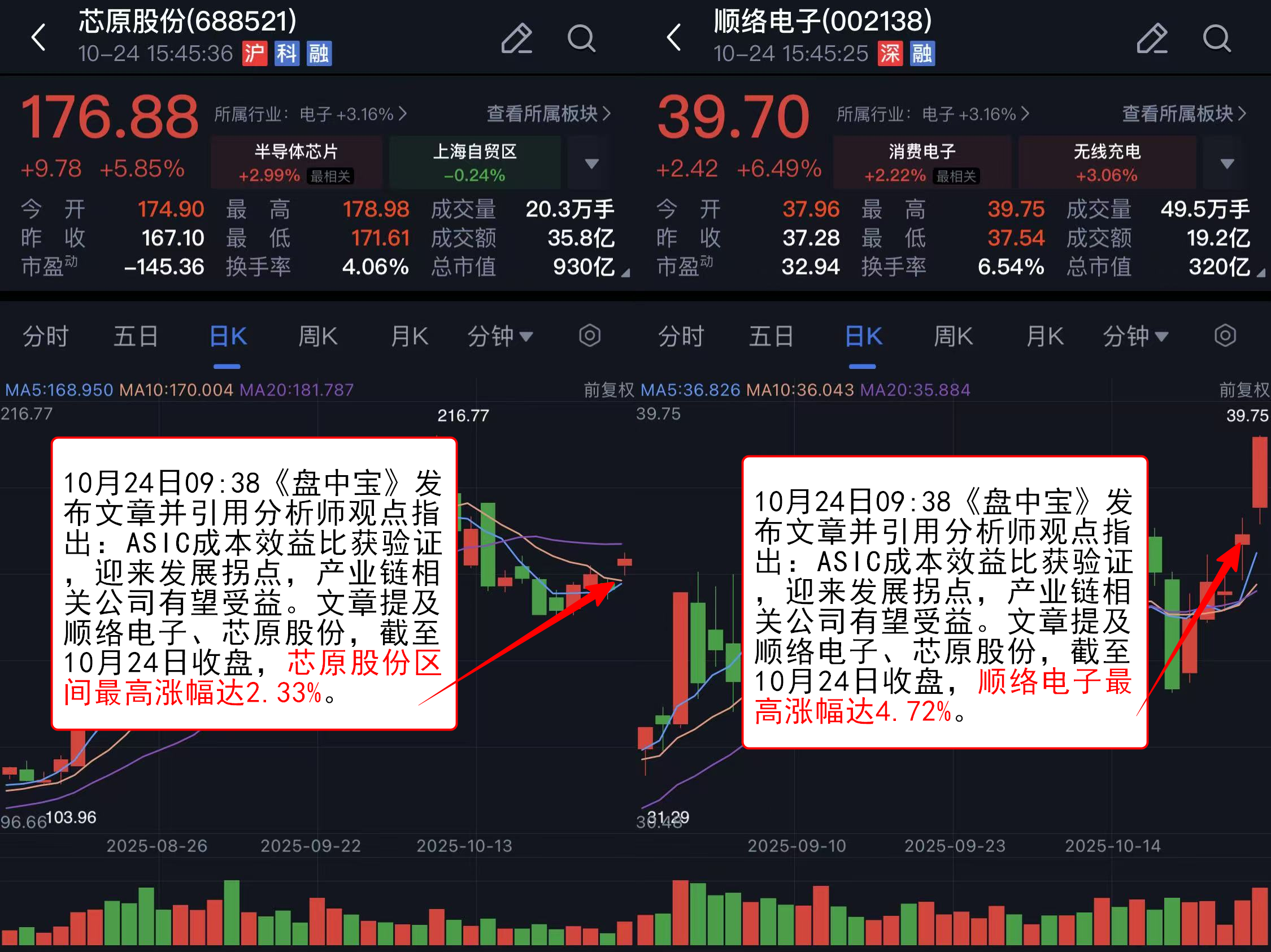 10月24日 09:38《盘中宝》发布文章并引用分析师观点指出:ASIC成本效益比获验证,迎来发展拐点,产业链相关公司有望受益。文章提及顺络电子、芯原股份,截至10月24日收盘,顺络电子最高涨幅达4.72%,芯原股份区间最高涨幅达2.33%。