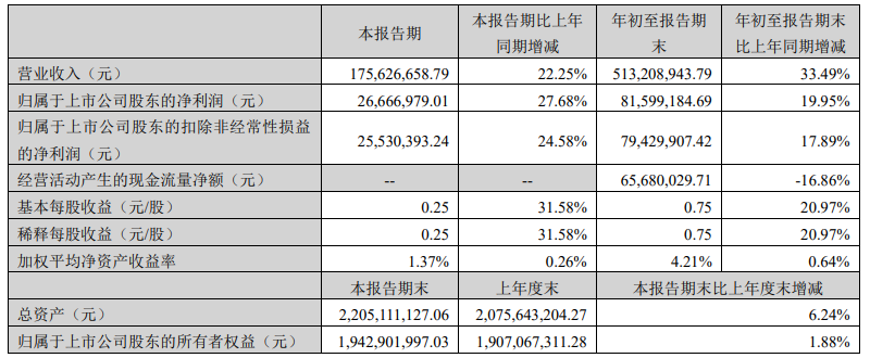 归属于上市公司股东的净利润为8159.92万元,同比增长19.95%。归属于上市公司股东的扣除非经常性损益的净利润为7942.99万元,同比增长17.89%。基本每股收益为0.75元。