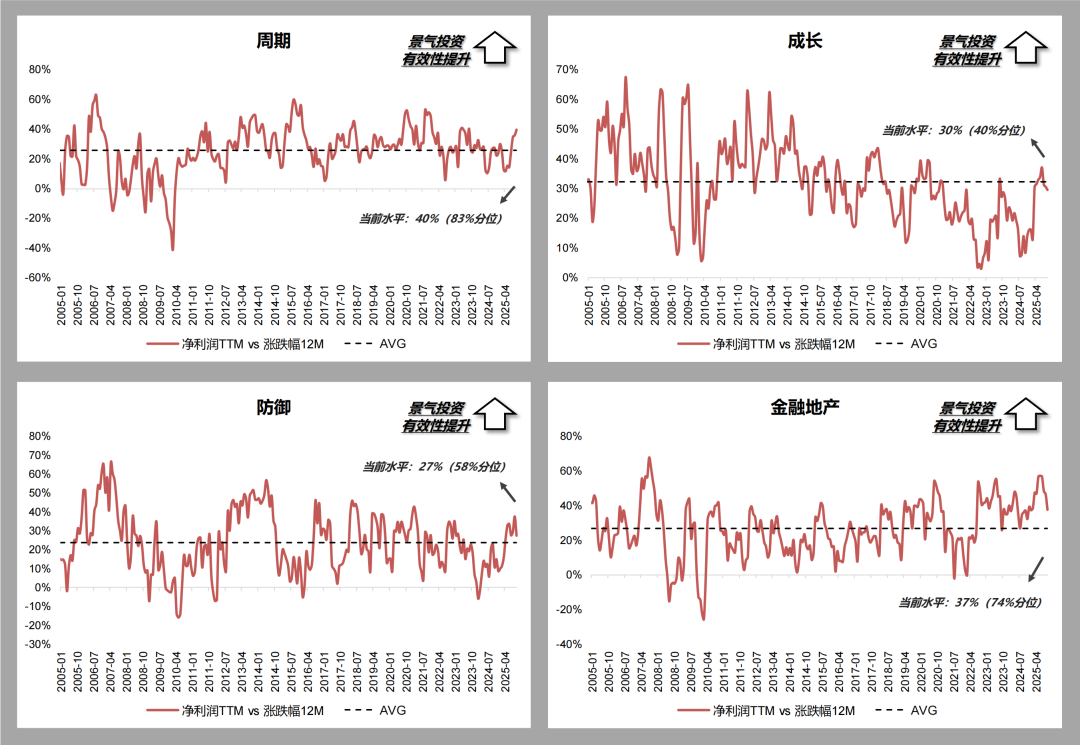 更进一步,通过计算【净利润增速和涨跌幅排位的相关性】来衡量市场景气投资有效性,我们发现自2005年以来: