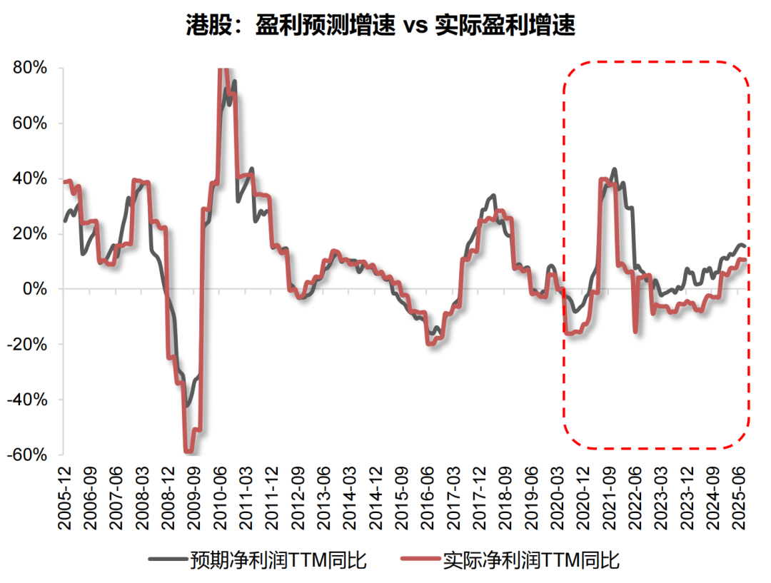 资料来源:香港交易所,美国证券交易委员会(SEC),国联民生证券研究所。注:数据截至2025年10月15日。宏观长周期上看,稳健的经济前景或支撑景气策略底层逻辑。总量上看,经济预期不稳定、基本面偏弱阶段,港股景气策略有效性相对较弱。此背景下,高景气企业未来的盈利增长能见度降低,景气投资的核心逻辑受损,且常常伴随中美利差收窄甚至倒挂,加大港股市场资金面压力,典型如2008年金融危机和2020年疫情期间。