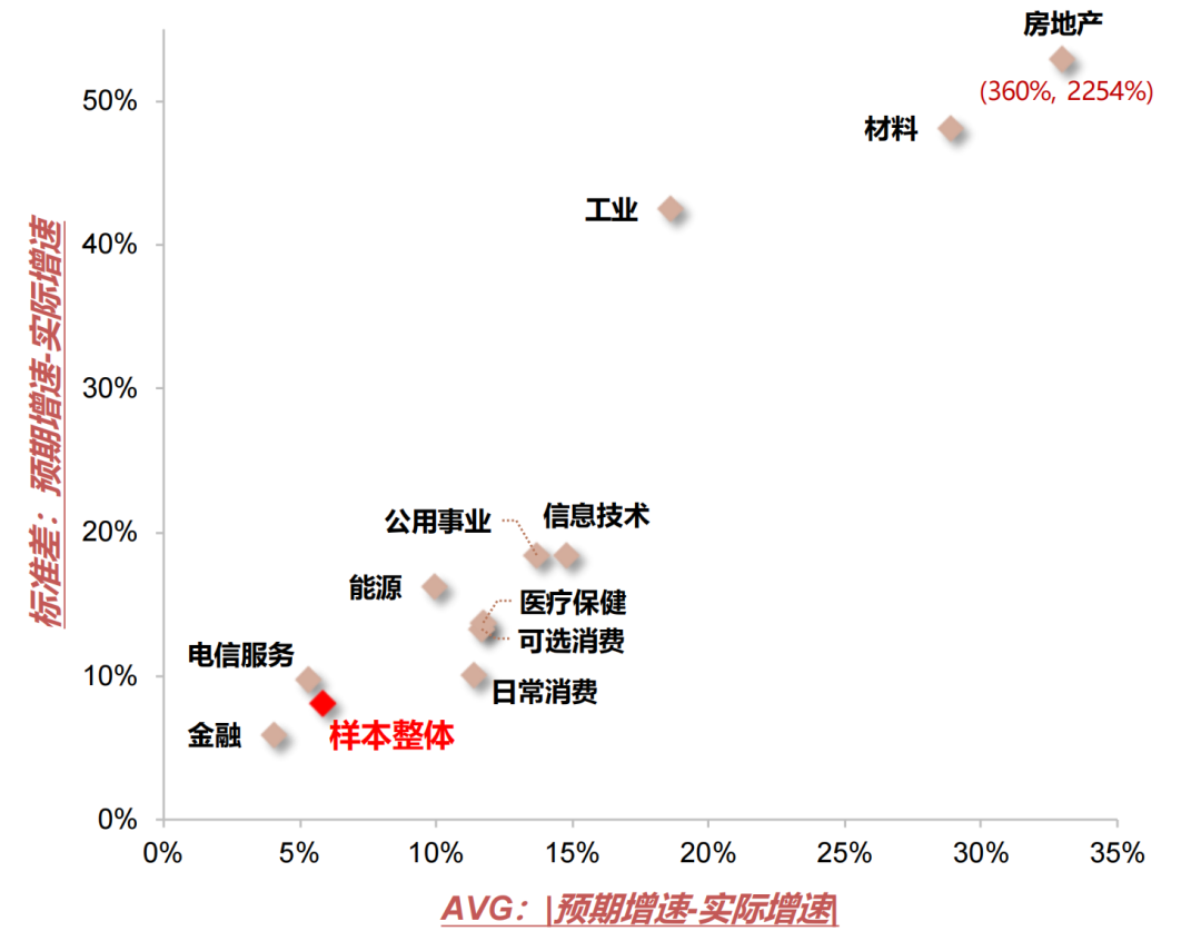 图表11:一致预期数据对金融、电信服务和日常消费行业的盈利增速预测准确度较高