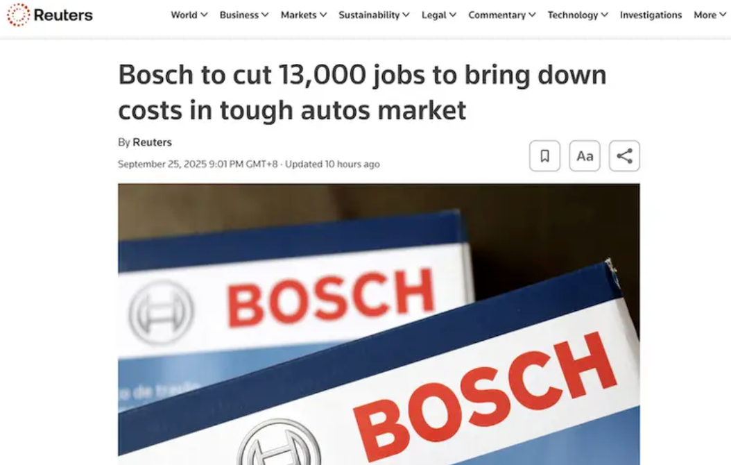 破产像股潮流,如多米诺骨牌一般席卷汽车制造业。2024年德国每6家破产的大型企业中就有一家是汽车零部件商。如雷贯耳的汽车厂商们也开始收缩、裁员,全球第一Tier1巨头博世近期被曝将裁员1.3万人,加上此前的裁员规模已经超过2.5万人;采埃孚计划在德国削减1.1万至1.4万个岗位;大众也计划到2030年前让3.5万人下岗。