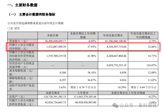 10月24日,中信特钢发布2025年三季报。报告显示,公司前三季度营业收入为812.06亿元,同比下降2.75%;归母净利润为43.30亿元,同比增长12.88%;扣非归母净利润为42.89亿元,同比增长14.71%;基本每股收益0.86元。