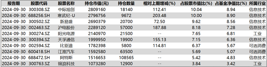 以景顺长城稳健回报A为例,2024年三季报基金前十大重仓股,高度聚焦AI产业链,特别是接手以后,江山大幅提高寒武纪的仓位占比。当时市场对AI算力芯片的前景存在分歧,寒武纪的股价尚处于低位。江山敏锐地意识到,随着大模型技术的快速发展,AI算力需求将呈现爆发式增长,而寒武纪作为国内少数几家能够提供AI芯片的公司,将受益于这一趋势。