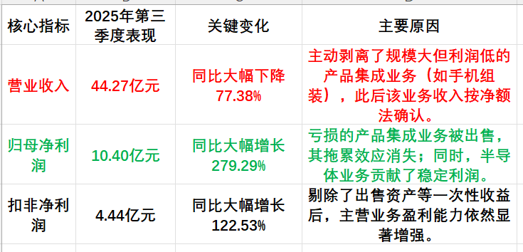 闻泰科技2025年第三季度报告的核心信息可以概括为:公司正处于一场“大象转身”式的业务转型中。虽然整体营收大幅下降,但利润却强劲增长,这背后是公司业务结构的根本性变化。