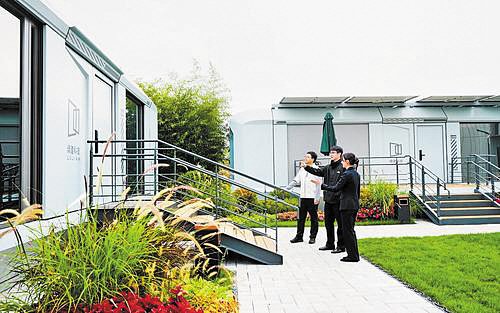 10月15日,在高碑店市奥润顺达绿建科技产业基地,讲解员(右一)为参观者介绍新一代移动装配式健康建筑“太空房”。 奥润顺达集团供图