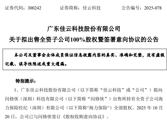 近日,广东佳云科技(维权)股份有限公司发布公告,拟出售其全资子公司海力保险经纪(深圳)有限公司全部股权。为聚焦公司主营业务发展,佳云科技已于2025年10月20日与闪修侠(深圳)科技有限公司签署《股权收购意向协议》,计划将所持海力保险经纪100%股权转让予闪修侠。