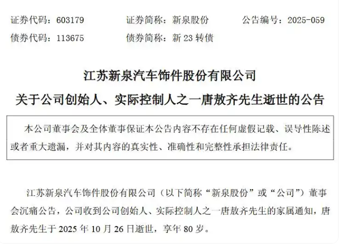 10月27日,江苏新泉汽车饰件股份有限公司(以下简称“新泉股份”)发布公告称,公司收到公司创始人、实际控制人之一唐敖齐的家属通知,唐敖齐于2025年10月26日逝世,享年80岁。