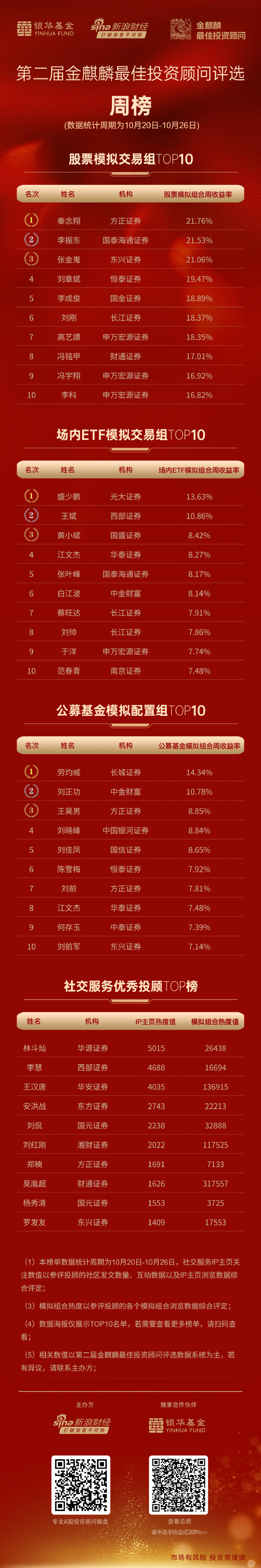 目前金麒麟最佳投资顾问评选火热进行中!股票模拟交易、场内ETF模拟交易、公募基金模拟配置、社交服务评比……万名投顾大PK,周榜数据(周期为10月20日-10月26日)显示,股票模拟组合评比方正证券投顾秦念翔以周收益率21.76%居周榜首位,其次国泰海通证券投顾李振东以周收益率21.53%居第二,东兴证券投顾张金嵬以周收益率21.06%居周榜第三。