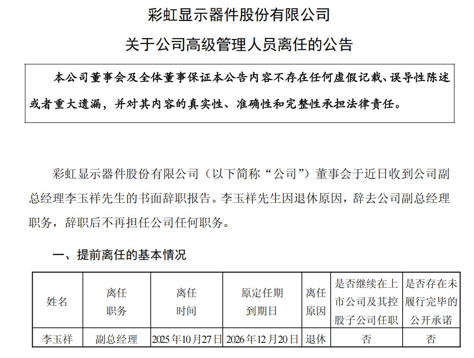 10月27日晚间,彩虹光电发布公告称,彩虹显示器件股份有限公司(以下简称“公司”)董事会于近日收到公司副总经理李玉祥先生的书面辞职报告。李玉祥先生因退休原因,辞去公司副总经理职务,辞职后不再担任公司任何职务。