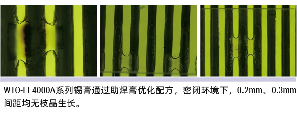 通过优化配方,该系列锡膏在密闭环境下 0.2mm、0.3mm 间距均无枝晶生长,为高可靠性电路焊接提供有力保障。