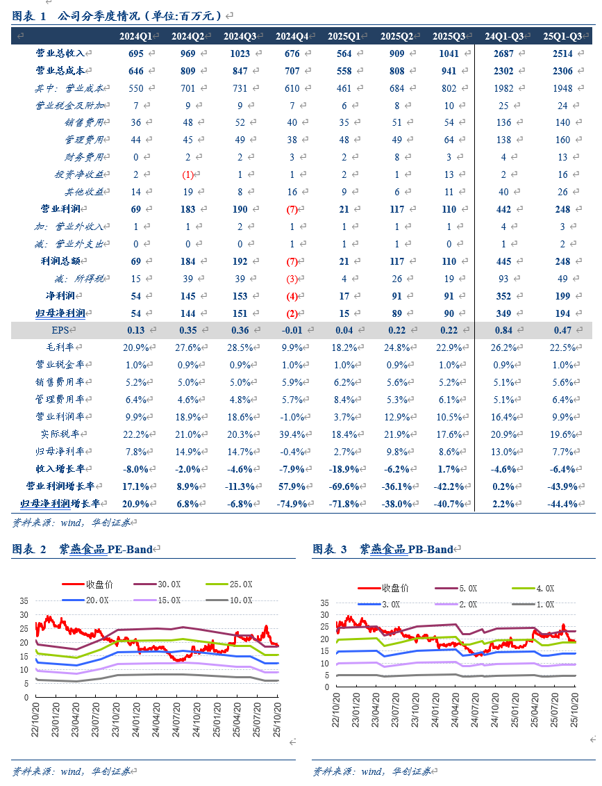 成本压力体现,加上规模效应损失,25Q3净利率延续承压。25Q3实现毛利率22.9%,同比-5.6 pcts,主要是进口牛肉等原材料价格同比提升,且出现一定的产品结构下滑、规模性效应损失,而在费用端,销售/管理费用率同比+0.1/+1.4pcts,最终归母净利率8.6%,同比-6.1pcts,整体延续年内利润承压趋势。