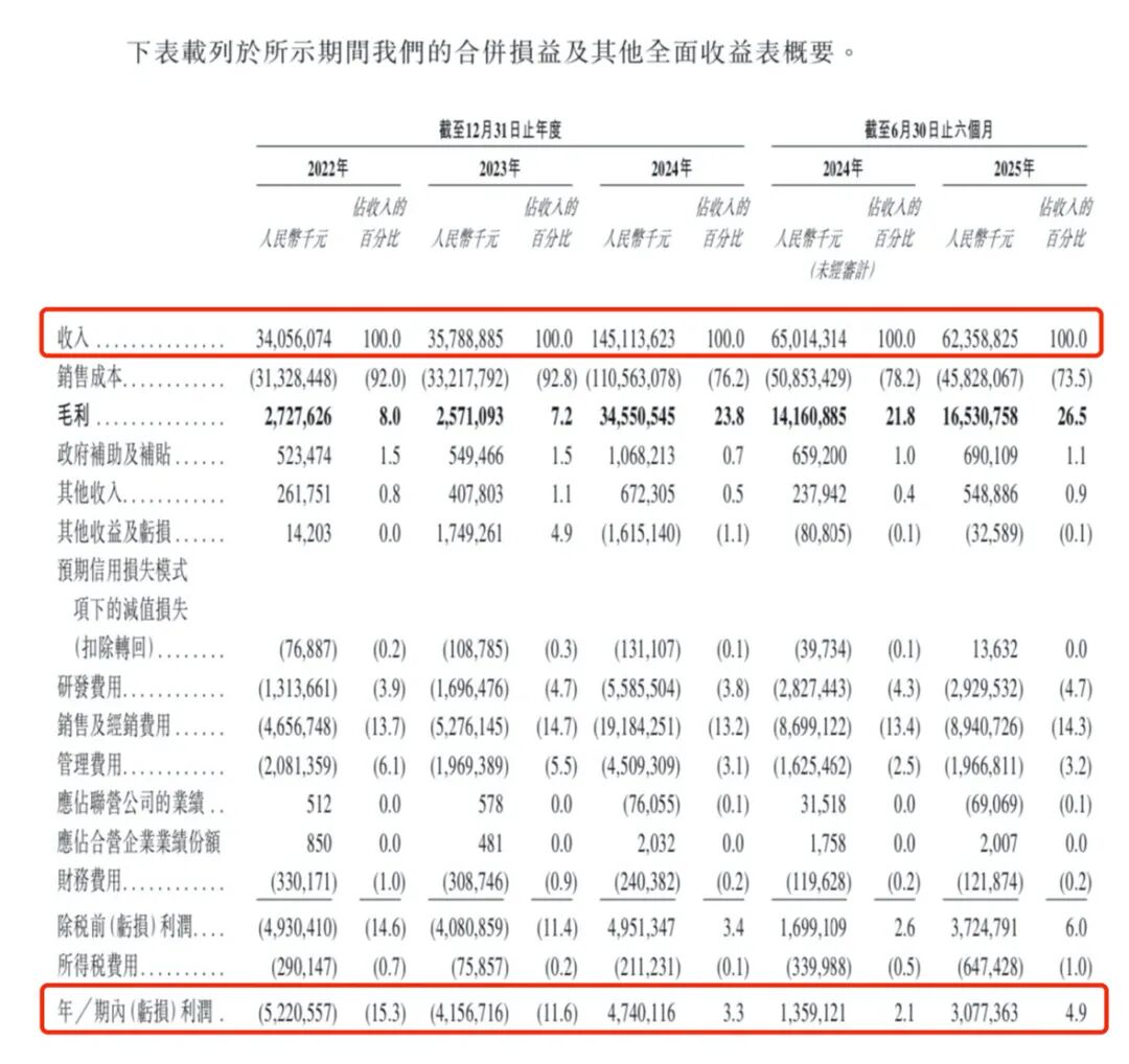 财务数据显示:在过去的2022年~2024年,赛力斯的营业收入分别人民币340.56亿、357.89亿和1,451.14亿元;相应的净利润分别为人民币-52.21亿、-41.57亿和47.40亿元。