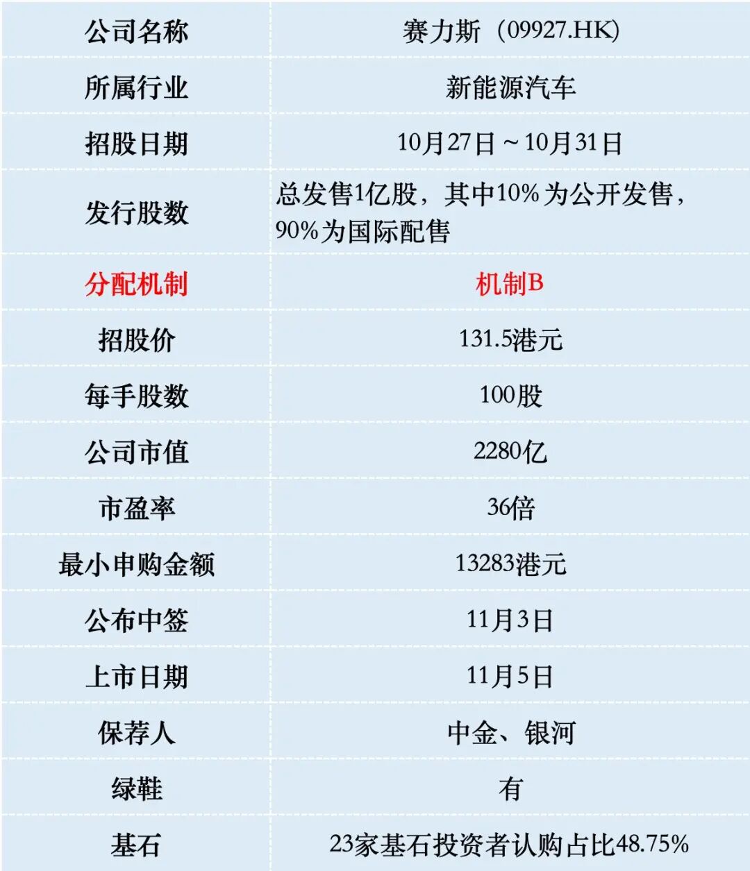 赛力斯本次IPO发行股份占全部股份比例的5.78%,按招股价131.5港元算,募资约131.76亿港元,23名基石投资者锁定64.2亿,流通盘67.6亿,这个流通盘很大。