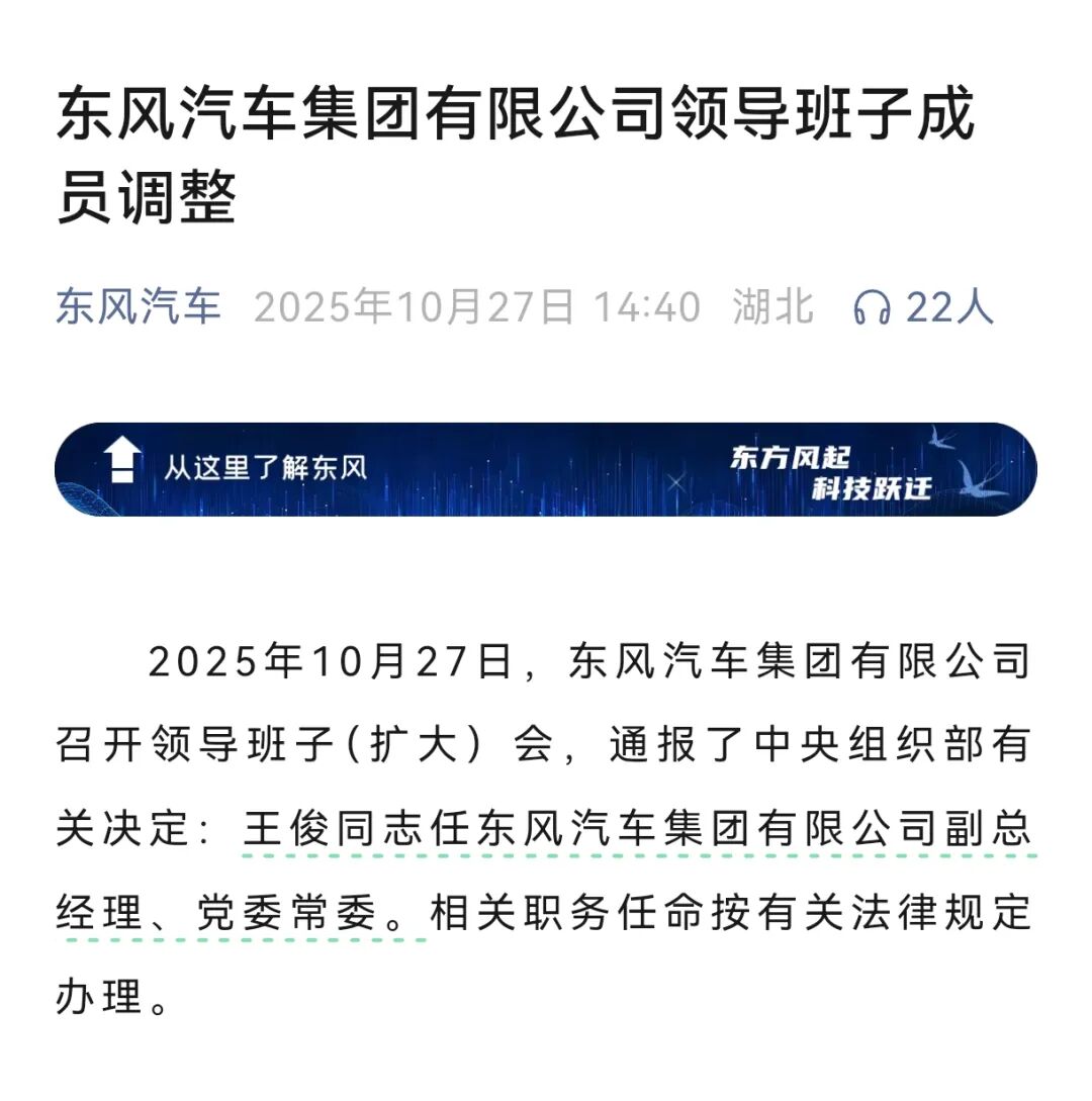 10月27日,东风汽车集团有限公司召开领导班子(扩大)会,通报了中央组织部有关决定:王俊同志任东风汽车集团有限公司副总经理、党委常委。