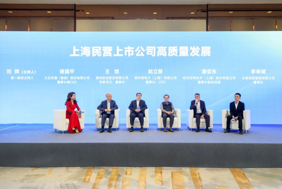 圆桌对话环节,大众交通、春秋航空、格科微、和元生物、水星控股5家专委会主任单位以“上海民营上市公司高质量发展路径”为主题,围绕科技创新成果转化、提升核心竞争力、产业链业态融合等方面进行深入探讨。