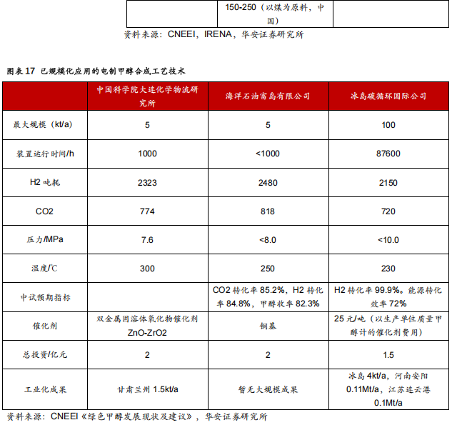 我国可再生能源发展推动了电制甲醇的发展。电解水制氢成本主要取决于电力成本,电解水制氢中电力成本占制氢成本的 80%左右。在我国,当前风电、光伏已经成为最便宜的电力,西北地区的度电成本可以低至 0.1~0.2 元/kWh。电制甲醇的另一大关键原料是 CO2,根据 IRENA 的划分,只有生物质(BEC)与直接碳捕(DAC)所得 CO2 制取的甲醇才可认定为绿醇。通过生物质获取 CO2 的方法涉及环保、用地面积大及产量受环境影响波动大等问题。直接碳捕可以实现大规模的稳定碳源供给,并且无场地限制,但是能耗巨大,成本过高。目前直接碳捕的成本约为 200~250 美元/吨,远高于煤化工、天然气等集中碳源 20~40 美元/吨的水平。但直接碳捕的高成本也一定程度上由于其技术成熟度不高,吸附材料和工艺尚未成熟,若相关技术解决,DAC 应用潜力较大。从应用实例来看,目前中科院大连化物所、海洋石油富岛有相应技术储备,化物所技术已有多个工业化装置。