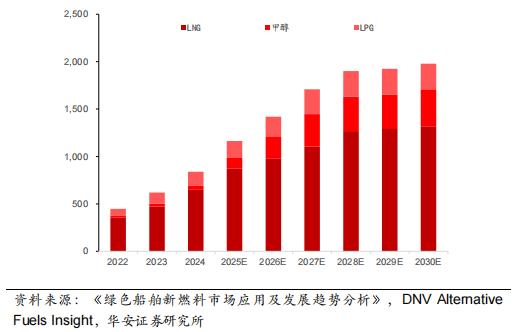 段。绿色甲醇由于便于储存和运输,港口改造难度小,被各研究机构认为是有效的解决方案。目前较多船东已押注甲醇燃料动力船,目前在运和有订单的甲醇燃料动力船达到 390 艘,根据在手甲醇动力集装箱船订单,我们预计到 2030 年这些订单释放后绿色甲醇需求量将在 900 万吨以上。根据罗兰贝格管理咨询预测,考虑到后续新增订单,预计 2030 年绿色甲醇需求将达到 1200 万吨。